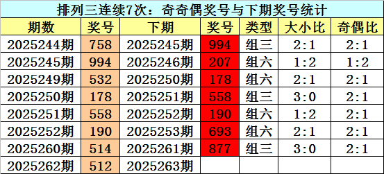奇偶判断:上期排列三奖号为512,奇偶为:奇奇偶,近7次出现奇偶:奇奇偶奖号分别为:758-994-532-178-558-190-514。