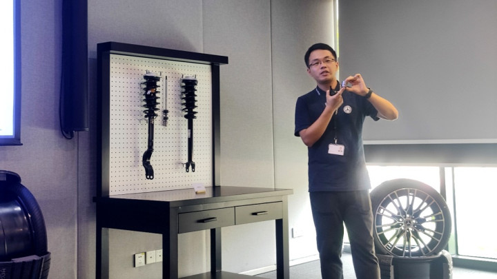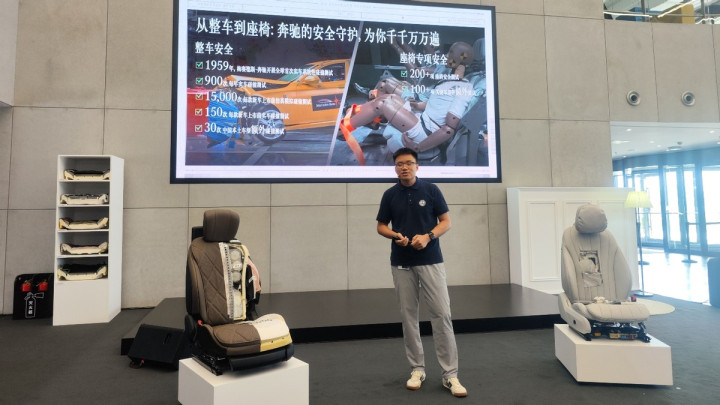 以我们的实际体验为例,2025奔驰标准科技日上,共设置了关于座椅、底盘、线控转向+EABC等具体的技术体验环节。奔驰的座椅特色是,它不止是大沙发,不追求绝对的软和绝对的硬。而是,座椅是和整车的底盘进行一同设计,同时考虑减缓底盘的冲击和传递到座椅上的冲击。